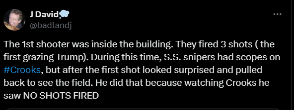 ("The 1st shooter was inside the building. They fired 3 shots (the first grazing Trump).")